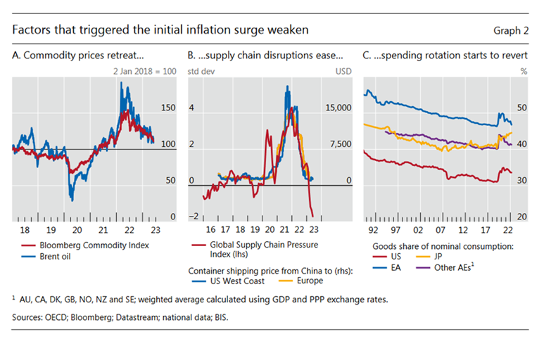 Twee recente papers zetten nu de analyse van ‘team tijdelijk’ opnieuw kracht bij. Ten eerste geeft het Annual Economic Report 2023 van de BIS duidelijk aan dat ondertussen alle grote grondoorzaken van de inflatie-opstoot zich inderdaad opnieuw aan het omkeren zijn (zie FIGUUR hieronder).