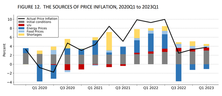 Ten tweede geven Ben Bernanke en Olivier Blanchard (zelf ooit lid van ‘team permanent’) in een recente conferentiepaper terugkijkend aan dat krappe arbeidsmarkten slechts beperkt verantwoordelijk waren voor de inflatie-opstoot in de VS (het rode balkje in hun kolomdiagram, zie FIGUUR hieronder), terwijl het merendeel van de prijsstijgingen wel degelijk veroorzaakt werd door aanbodschokken in goederen en energie (blauw) en verstoringen in toeleveringsketens (geel). Bovendien lijkt de kracht van die aanbodschokken de afgelopen tijd sterk te zijn teruggelopen. Dit suggereert dat de schokken inderdaad van voorbijgaande aard waren en er reden is om te verwachten dat – in de afwezigheid van een nieuwe reeks schokken – de huidige prijsdalingen zich spontaan zullen doorzetten. Wat we zien heeft met andere woorden meer weg van ‘onbevlekte disinflatie’ dan van intentionele disinflatie (als gevolg van restrictieve beleidsingrepen).