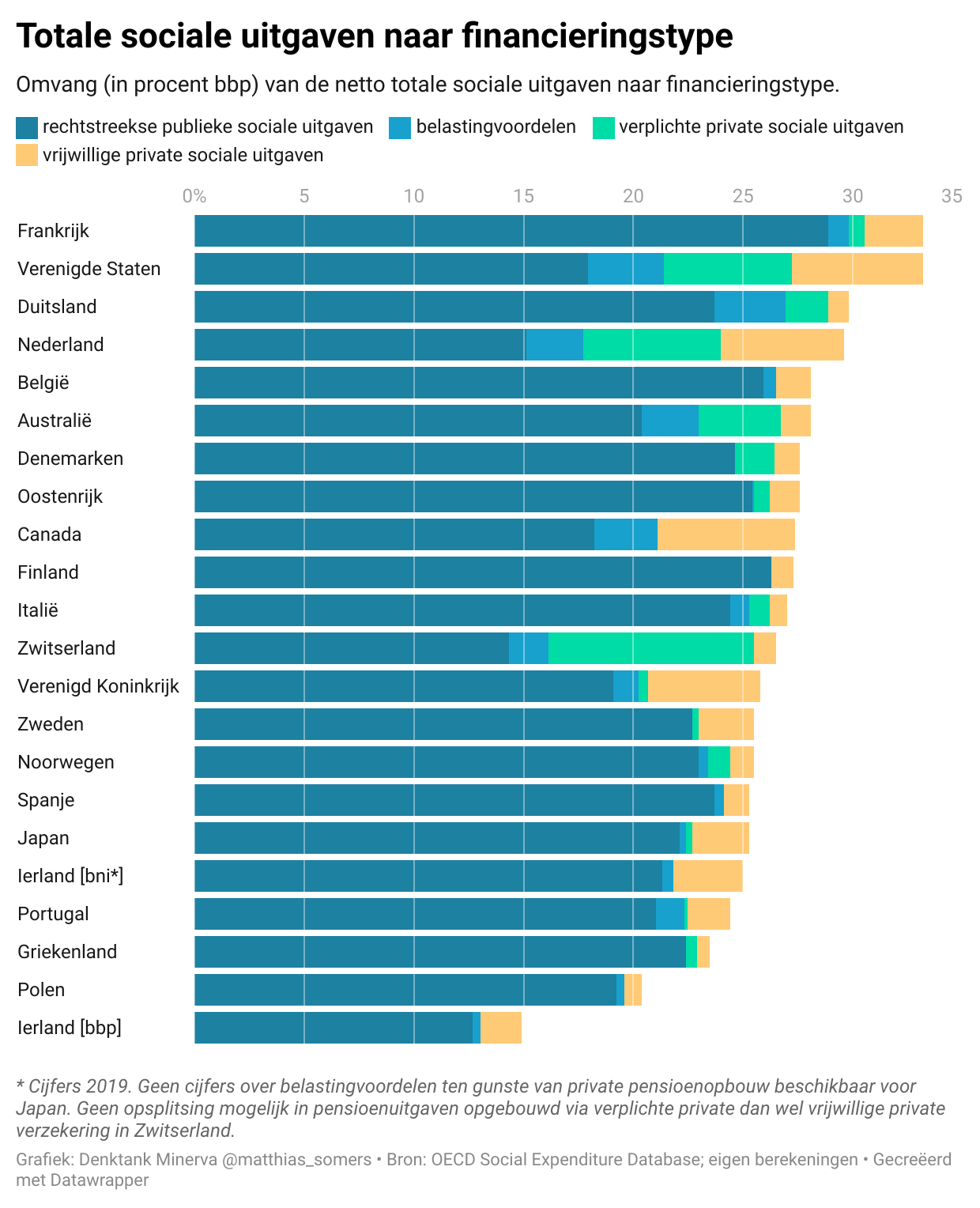 Wanneer we onze blik dus verruimen van de rechtstreekse publieke sociale uitgaven en ook de private sociale uitgaven in rekening brengen, ontstaat een heel ander beeld van de kost van het sociaal beleid in België, de buurlanden, en andere vergelijkbare hoge-inkomenslanden (ZIE FIGUUR). Wat blijkt? België besteedt minder middelen aan sociaal beleid dan Frankrijk, de Verenigde Staten, Duitsland en Nederland, en ongeveer evenveel als Australië, Denemarken, Oostenrijk, Canada en Finland. Ierland, Portugal, Griekenland en Polen hinken achterop.