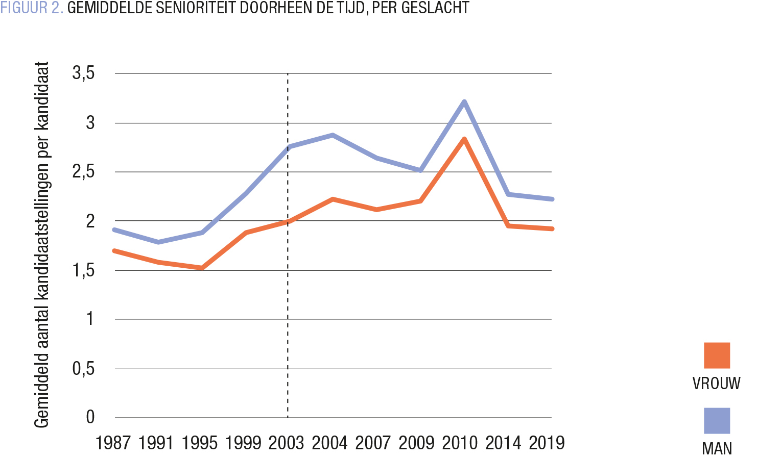 We zien ook dat het kandidatenverloop inderdaad altijd hoger is bij vrouwen dan bij mannen. Het aandeel nieuwe kandidaten is hoger bij de vrouwen, terwijl de gemiddelde senioriteit lager is. Op het eerste zicht liggen deze vaststellingen dus in de lijn van de offerlam-hypothese. Dat wordt ook bevestigd door het feit dat de invoering van de stringente 50-50 quotawetgeving vanaf 2003 (stippellijn in figuren) gepaard gaat met een groter verschil in kandidatenverloop. In beide grafieken neemt de afstand tussen de curves voor mannen en voor vrouwen toe. Maar op de lange termijn lijkt dit toegenomen verschil in kandidatenverloop opnieuw uit te vlakken. Zeker vanaf 2014 gaan de gendercurves in beide grafieken terug parallel lopen en is de afstand tussen de curves voor mannen en vrouwen zeer vergelijkbaar met die in de jaren 1980 en 1990.