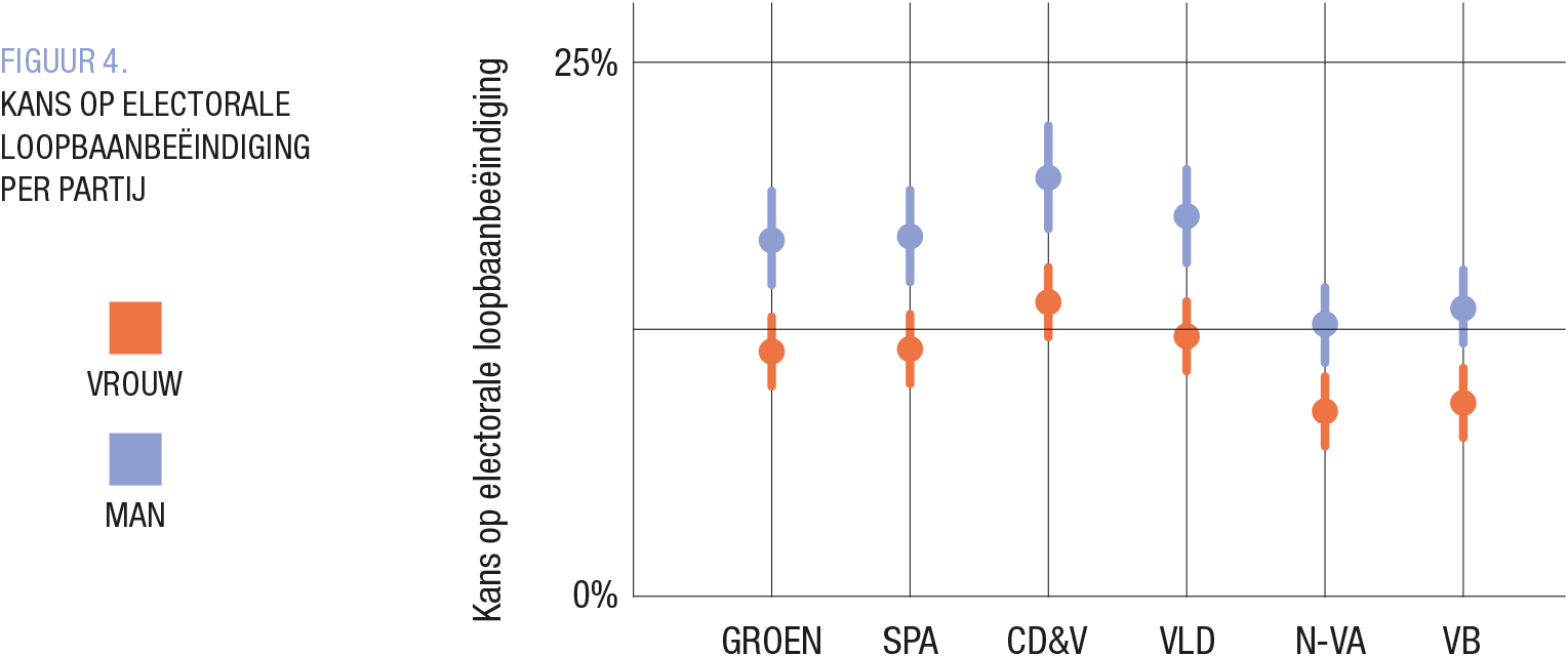 Wat blijkt dus? De kans op electorale loopbaanbeëindiging is, alle andere omstandigheden gelijkblijvend, groter voor mannen dan voor vrouwen, en dit in alle partijen. Anders gezegd, het klopt niet dat vrouwelijke kandidaten over het algemeen sneller een punt zetten achter hun carrière als kandidaat dan mannen. Het model bevestigt ook dat de kans op electorale loopbaanbeëindiging groter is voor kandidaten zonder bestuursfunctie op lokaal niveau, zonder parlementair mandaat en voor oudere kandidaten. Bovendien maken kandidaten die veel voorkeurstemmen halen ook meer kans om opnieuw kandidaat te zijn. Maar het is opmerkelijk dat dit beloningsmechanisme enkel speelt bij mannelijke kandidaten. Vrouwelijke kandidaten worden minder beloond voor een sterk resultaat, maar omgekeerd ook minder afgestraft voor een zwakke prestatie.