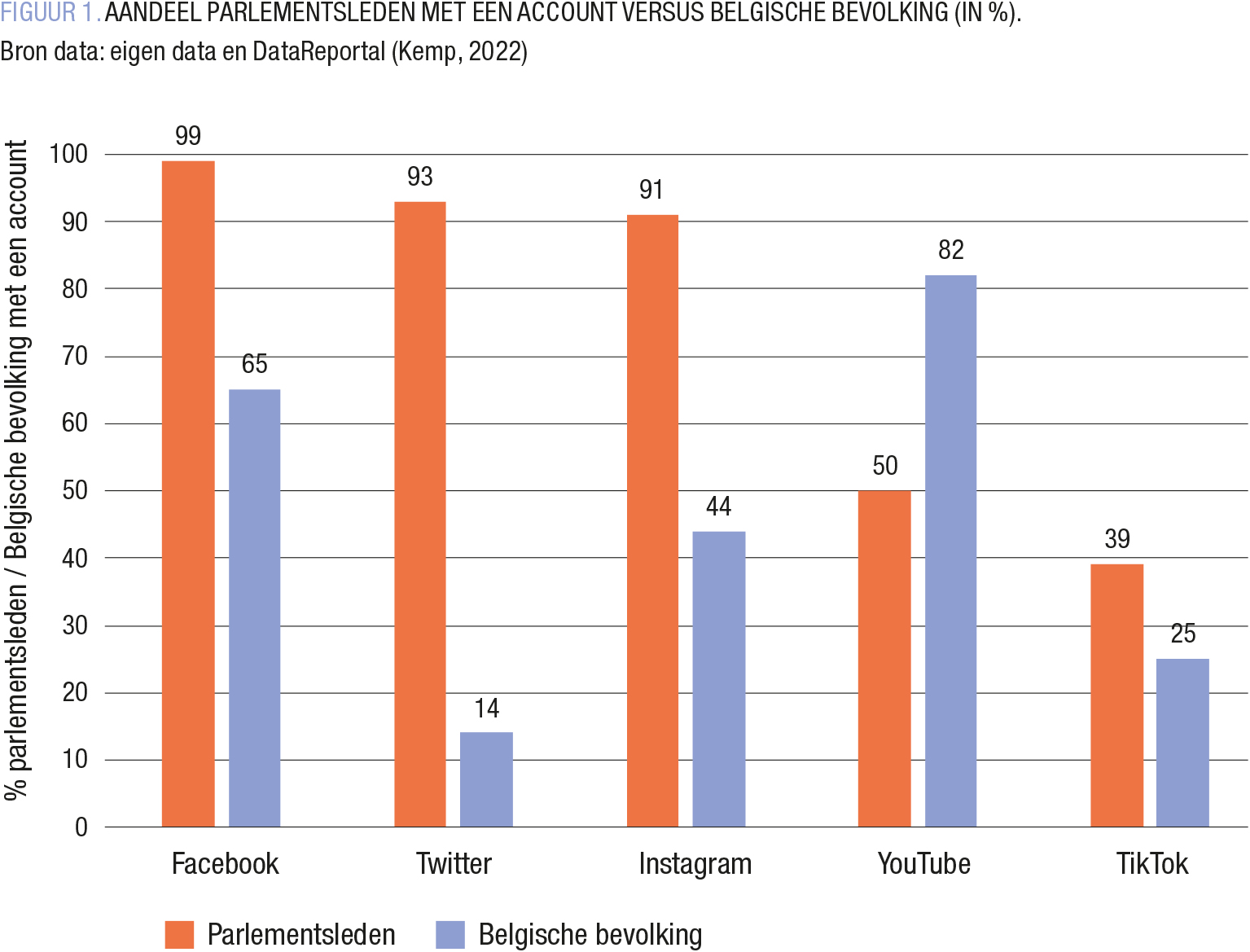 Ons onderzoek heeft betrekking op de sociale netwerkaccounts van 489 politici, of alle Belgische parlementsleden. We verzamelen gegevens over hun Facebook-, Twitter-, Instagram-, YouTube- en TikTok-accounts voor een periode van drie maanden eind 2022. Onze gegevens bevatten een indicatie van het gebruik van elk netwerk en het aantal volgers van elke politicus of politica.