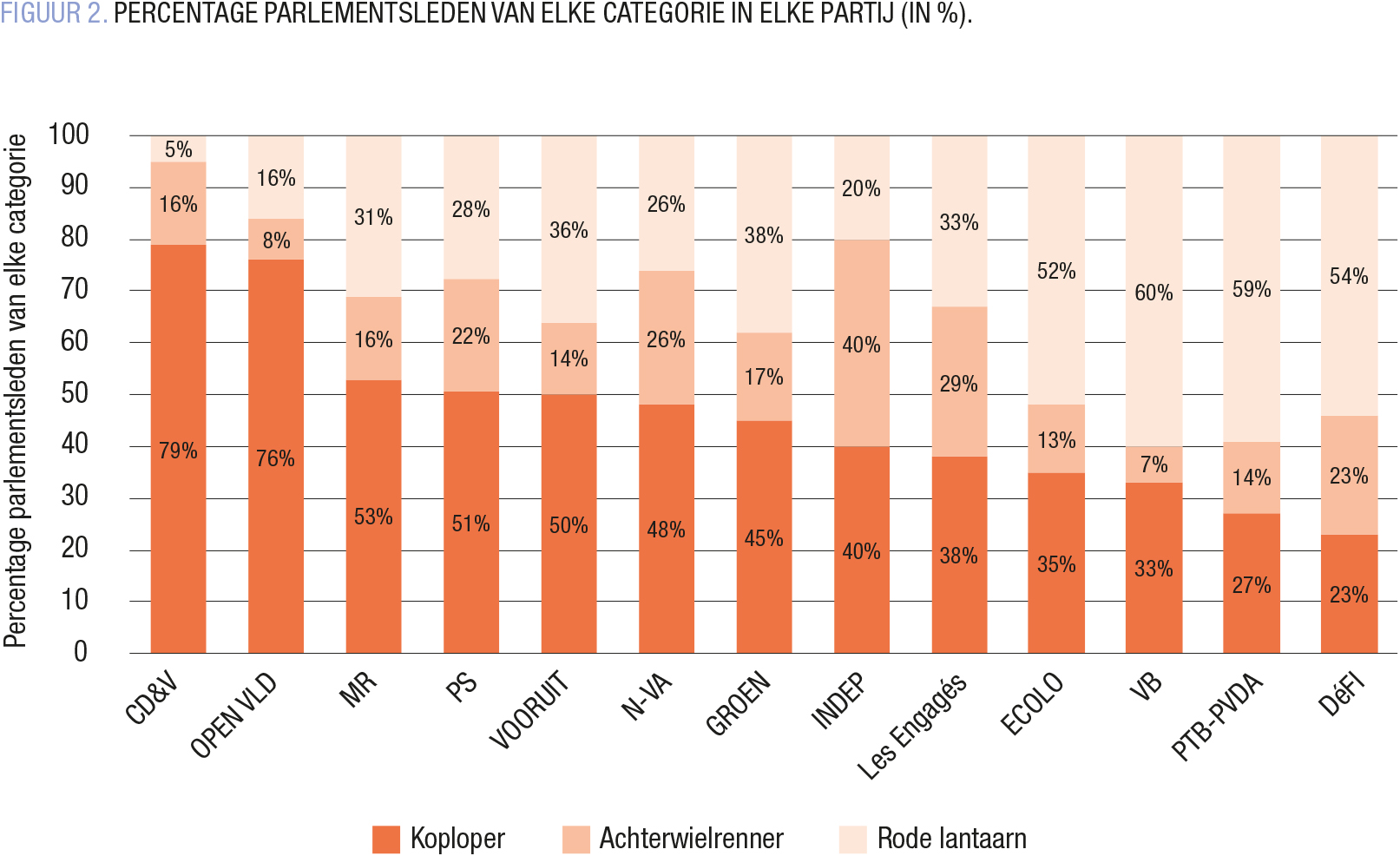 Laten we nu dieper ingaan op deze categorieën. FIGUUR 2 toont aan dat het percentage parlementsleden van elke partij in elke categorie sterk verschilt. CD&V en Open VLD zijn de partijen met de meeste koplopers. De top 3 bestaat uit CD&V (79%), Open VLD (76%) en MR (53%). Ecolo, DéFI, PTB-PVDA en Vlaams Belang tellen de meeste rode lantaarns – zij die niet echt succes hebben op sociale media.