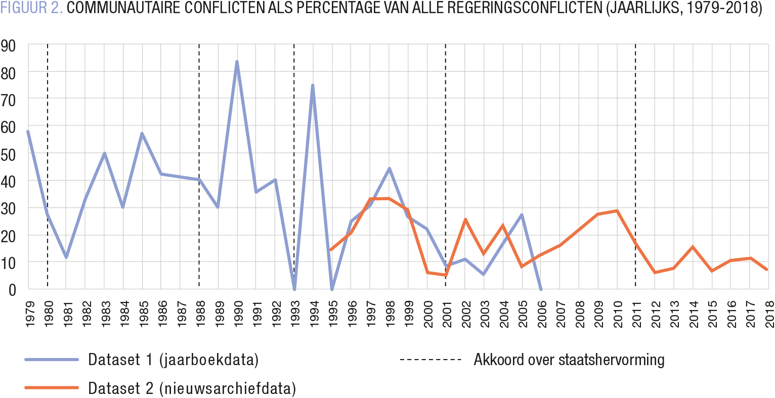 Het aantal communautaire conflicten nam duidelijk af doorheen de tijd. Liefst 21 indicatoren werden onderzocht, maar geen enkele indicator wijst op een duidelijke aanwezigheid van communautaire escalatie. Tegen de achtergrond van de opeenvolgende staatshervormingen tekent zich een gestage afname af van zowel het absoluut conflictaantal als het percentage regeringsconflicten dat communautair is (FIGUUR 2). Terwijl in het verleden soms meer dan de helft van alle conflicten in een regeringsjaar communautair was (vraag het maar aan Martens), blijft dat percentage sinds het einde van de jaren 1990 (dus na vier staatshervormingen) netjes onder de 30%. Sinds het akkoord over de zesde staatshervorming (2011), die ondanks haar gebreken een ongeziene periode van stabiliteit inluidde, gaat het zelfs om amper 10 à 15%.