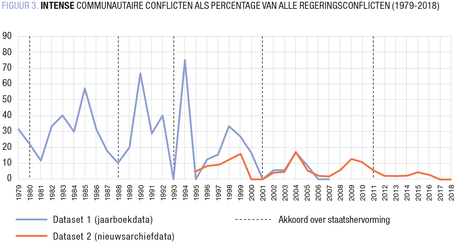 Op diezelfde manier werden ook opeenvolgende regeringen vergeleken, net als subtypes van communautaire conflicten en de aantallen intense conflicten, waarbij bijvoorbeeld het voortbestaan van de regering in het gedrang komt (FIGUUR 3). De indicatoren wijzen op dezelfde conclusie: regeringsconflicten zijn van alle tijden, maar communautaire conflicten worden zeldzamer. Staatshervormingen pookten de spanningen niet op en zorgden er niet voor dat politici conflict steeds vaker verkiezen boven samenwerking. Vroeger was het niet beter.