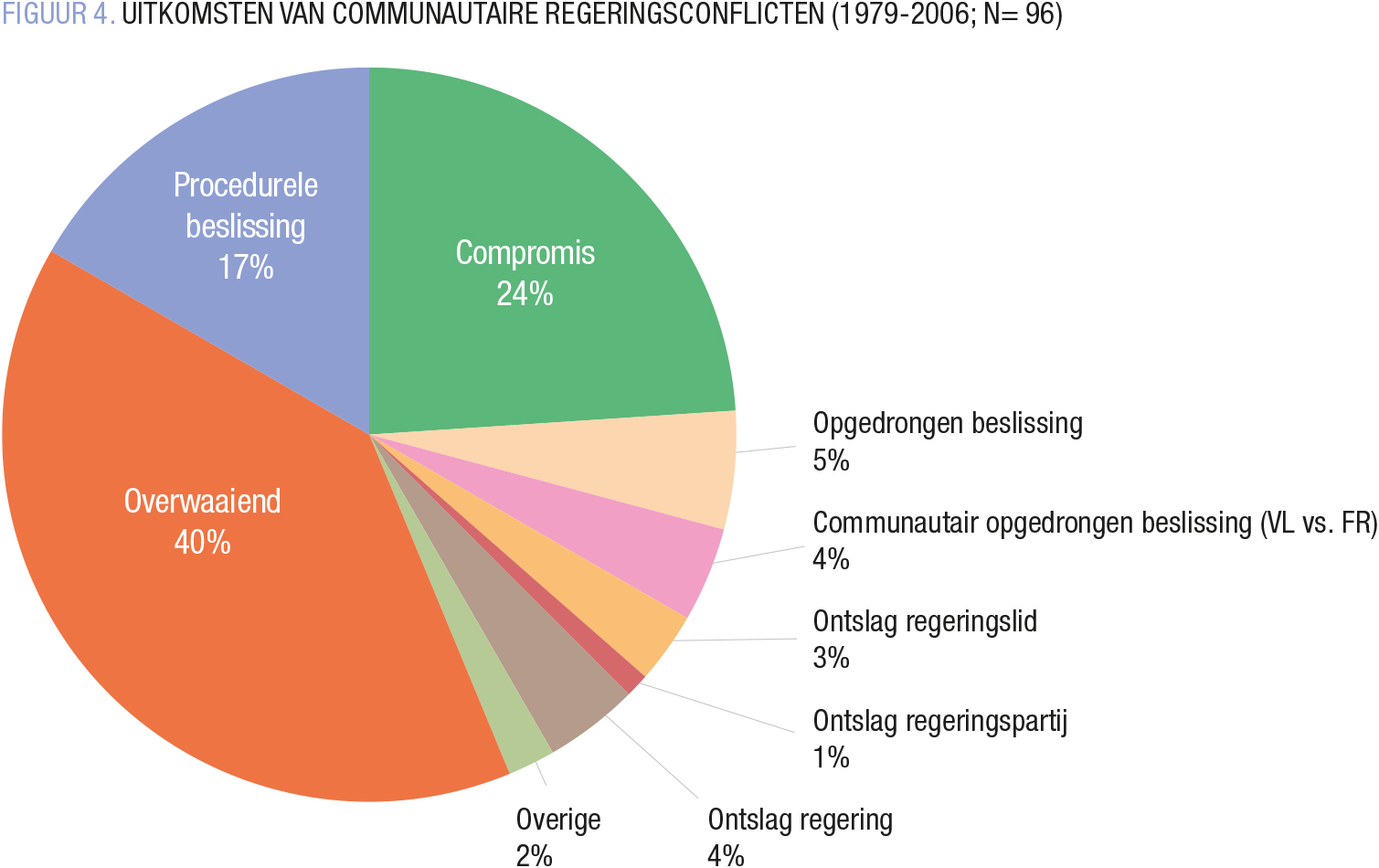 Neen. Analyses van de uitkomsten van conflicten tonen aan dat Belgische regeringen effectief vaak blijven steken in besluiteloosheid (FIGUUR 4). Terwijl zo’n 40% van alle communautaire conflicten zonder enig tastbaar gevolg overwaait, wordt een klein vijfde beslecht via een procedurele ‘beslissing om niet te beslissen’, zoals de keuze om een commissie op te richten, de deadline op te schuiven of de hete aardappel te laten afkoelen door een uitgebreid expertenadvies te vragen. Terwijl onze politieke geschiedenis bol staat van zo’n voorbeelden, eindigt slechts een kwart van alle communautaire conflicten in een echt compromis (inhoudelijk akkoord, door alle partners onderschreven). In dit opzicht doet de federale politiek denken aan een driepotige race waarbij kinderen aan elkaar worden vastgebonden bij hun benen. Vlaamse en Franstalige politici worden via een hele reeks procedures verplicht om samen te werken (alarmbelprocedure, pariteit in de ministerraad, bijzondere meerderheden, enzovoort). Zodra spanningen opduiken wordt het in zo’n systeem lastig om de eindmeet te bereiken. De verplichte samenwerking wordt dan een smerig moddergevecht. Dat gevecht werd echter niet smeriger doorheen de tijd. Staatshervormingen maakten het dus niet gemakkelijker, maar ook niet moeilijker om de resterende conflicten op te lossen. De federale besluiteloosheid (na conflicten) is eerder consistent hoog.
