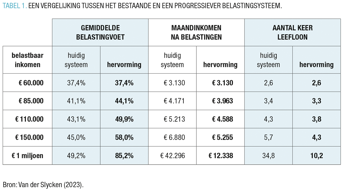 Deze grootverdieners gaan hierdoor geen boterham minder eten. Want minder dan 5% van de bevolking had in 2017 een belastbaar inkomen hoger dan €60.000. Met een inkomen van meer dan €150.000 zat je tot de top 1%, terwijl slechts 0,5% meer dan €150.000 had. De sterkte schouders kunnen best wat meer lasten dragen. Zoals TABEL 1 illustreert, verdient iedereen door deze progressieve hervorming netto minder dan 10,2 keer het leefloon – €1.214,13 per maand voor een alleenstaande begin 2023. Voldoende loon naar werken.