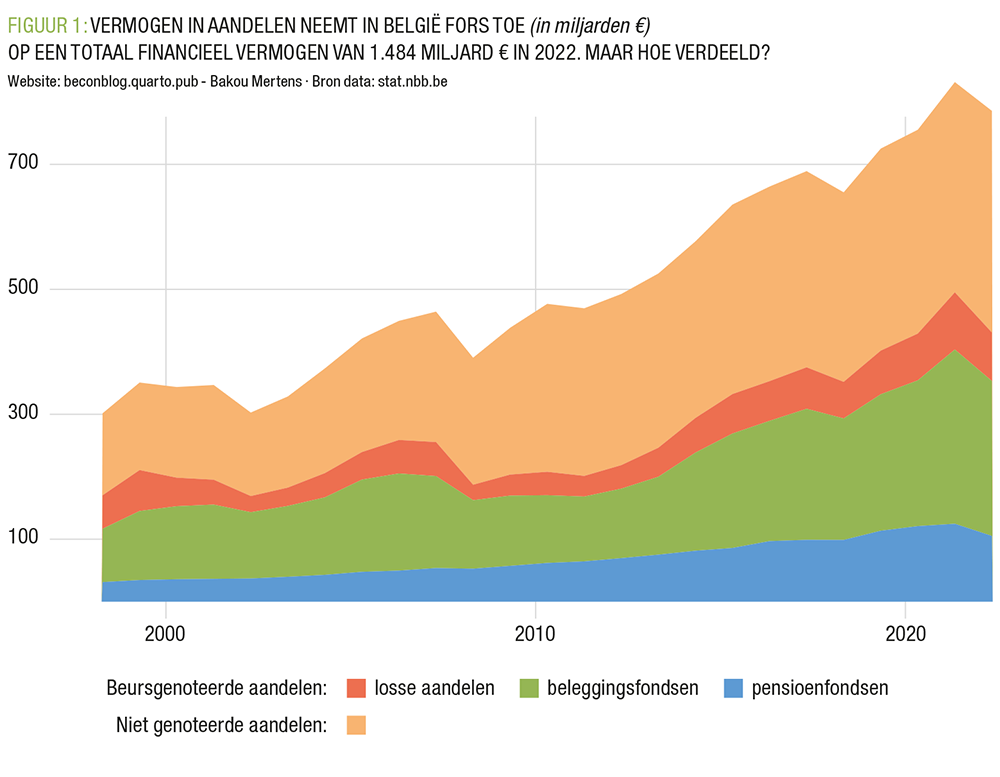 - De elementen in deze grafiek optellen voor 2022 geeft een totaal van 785 miljard euro. Daarvan is echter niet alles in aandelen belegd. In de categorie pensioenfondsen en beleggingsfondsen zitten namelijk ook obligaties en andere financiële instrumenten, al zijn ook daar aandelen wel dominant. Zie: 2022_dashboard_q4.pdf (fsma.be).↑
