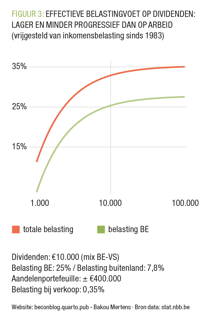 Dat valt in de praktijk ook nogal tegen. FIGUUR 3 geeft de effectieve belastingvoet op het dividendinkomen uit een portfolio aandelen bestaande uit een gelijke mix van Belgische en buitenlandse (bijvoorbeeld Amerikaanse) bedrijven. Ondanks dat het tarief van 30% in België vlak is – dat wil zeggen in tegenstelling tot de personenbelasting voor iedereen gelijk – zorgt een vrijgestelde som van 800 euro per jaar voor enige progressiviteit in de effectieve belastingvoet. Bovendien heffen buitenlandse overheden meestal eerst een percentage (15%) op de door hun bedrijven uitgekeerde dividenden. Op een inkomen uit dividenden van 10.000 euro, waarvan 5.000 afkomstig uit België en 5.000 uit het buitenland (bijvoorbeeld VS) betaal je 25% roerende voorheffing aan de Belgische schatkist en 7,6% aan de Amerikaanse. Vergelijk dat met onze belasting op arbeid en je merkt al snel de scheeftrekking in ons belastingstelsel en de dringende nood aan hervorming. Belangrijk hierbij is dat deze persoon naast die 6.715 euro netto ook nog eens ongeveer 400.000 euro aan aandelen op zak heeft, die hij op elk moment kan verkopen zonder daarop belastingen te hoeven betalen. Ook in het geval van meerwaarden – 1.000 dollar in Apple in 1980 zou vandaag 1,8 miljoen waard zijn – moet er in België geen belasting worden betaald. Het is dus niet zo dat inkomen uit financieel vermogen helemaal niet wordt belast, maar in elk geval heel weinig in vergelijking met onze bijdragen op arbeid.