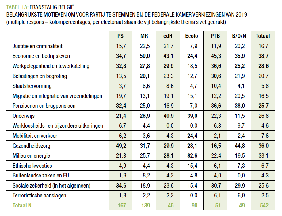 Gegeven deze constellatie kan je verwachten dat het stemgedrag voornamelijk aangestuurd worden vanuit de sociaaleconomische en culturele links-rechts breuklijnen (kortetermijninvloeden – zoals kandidaten, breuklijnonafhankelijke problematieken, dienstbetoon, enzovoort – terzijde gelaten). Een inkijk in de belangrijkste ‘issues’ die onderliggend zijn aan het stemgedrag kan deze stelling kracht bijzetten. In ons verkiezingsonderzoek vroegen we respondenten om uit een vaste lijst drie thema’s aan te kruisen die hun stemgedrag hadden bepaald. TABEL 1A en TABEL 1B geven (per electoraat en per taalgroep) de voornaamste thema’s weer.