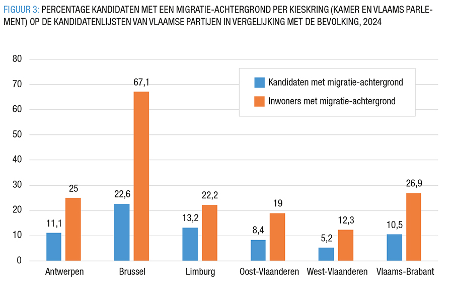 De grote verschillen tussen de kieskringen springen onmiddellijk in het oog. In Brussel heeft 22,6% van de kandidaten op de kandidatenlijsten voor het Vlaams Parlement een migratie-achtergrond, terwijl in West-Vlaanderen slechts 5,2% van de kandidaten wortels heeft in de migratie. Dat verschil is onder andere te verklaren door de aanwezigheid van de migratiepartij Team Fouad Ahidar in Brussel en natuurlijk ook door de grotere aanwezigheid van mensen met migratieroots in de hoofdstad. In Brussel heeft ruim 67% van de inwoners een migratie-achtergrond, terwijl dat in West-Vlaanderen beperkt is tot 12,3%.