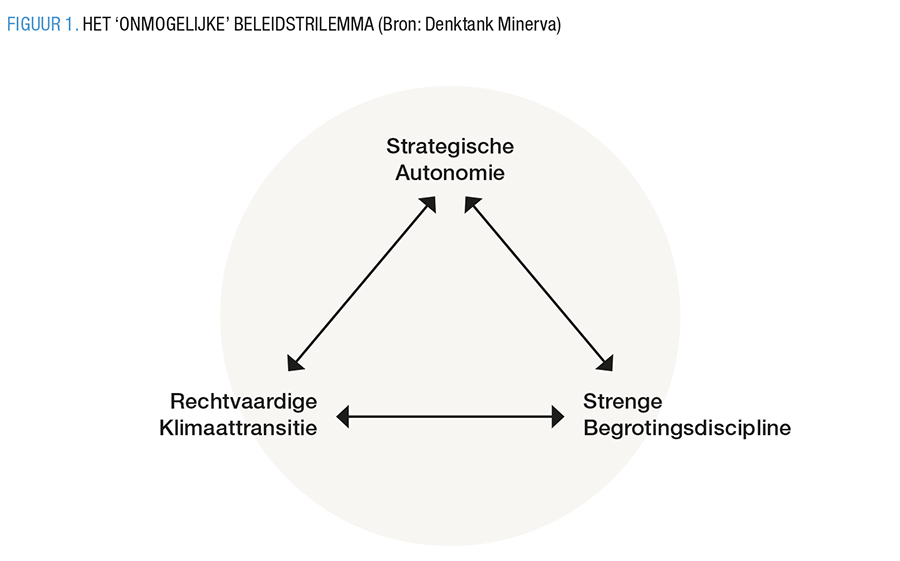 De bovenstaande uitdagingen en strikte regels lijken de Europese en nationale beleidsmakers bijgevolg te confronteren met een ‘onmogelijk’ beleidstrilemma (FIGUUR 1).13 Het nastreven van 1) strategische autonomie, 2) het versneld voltooien van een rechtvaardige transitie en 3) het handhaven van een strenge begrotingsdiscipline op hetzelfde moment is simpelweg onmogelijk. De verschillende hoekpunten zijn onderling onverenigbaar. Hoogstens twee van de drie beleidsdoelstellingen laten zich combineren. Kern van het trilemma is dat de noodzakelijke investeringen in industrie-, defensie-, klimaat- en sociaal beleid met elkaar zullen moeten wedijveren indien de derde doelstelling van begrotingsdiscipline gerespecteerd wordt.14