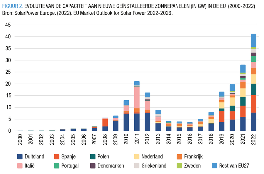 Met de goedkeuring van het nieuwe kader hebben beleidsmakers zich dus in een ‘Catch 22’ situatie gemanoeuvreerd. Hoekpunt 1 (‘rechtvaardige klimaattransitie’) loslaten, zou een scherpe terugval in investeringen in groene technologieën betekenen (zoals ook gebeurde bij de vorige besparingsrondes in 2011 – FIGUUR 2) en zou verder maken dat de kosten van klimaatmitigatie en -adaptatie op de middellange termijn alleen maar toenemen. Bij het lossen van hoekpunt 2 (‘Strategische autonomie’) lonkt economische stagnatie en militaire verzwakking. Hoekpunt 3 (‘strenge begrotingsdiscipline’) loslaten, betekent dan weer dat dat de Europese strafbank wenkt.