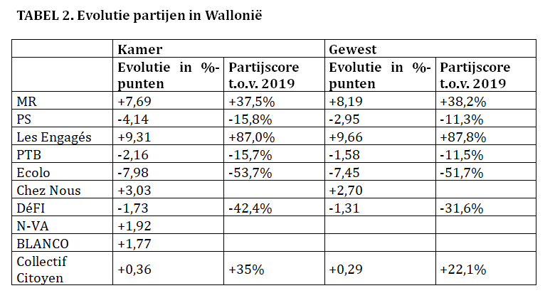 Cijfermatig is de nederlaag van Ecolo de meest opvallende : de Franstalige Groenen verloren 8 procentpunten ten opzichte van 2019 (TABEL 2) en meer dan de helft van hun electoraat. De parlementaire gevolgen zijn aanzienlijk. Ecolo houdt in de Kamer slechts 2 zetels over, waarvan 1 uit Wallonië. En in het Waalse parlement verliest Ecolo 7 van haar 12 zetels.
