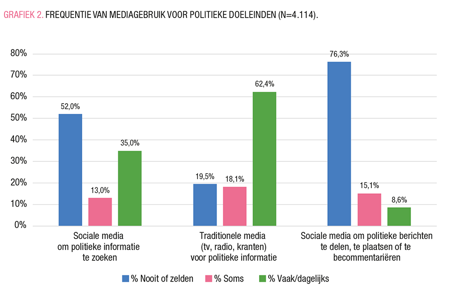 Ten slotte zijn de geruchten waar: driekwart van onze respondenten verklaart dat ze zelden of nooit politieke berichten online delen, posten of becommentariëren, wat bevestigt dat politiek gebruik van sociale media slechts tot een kleine minderheid beperkt blijft. Degenen die beweren 'soms' of 'vaak/dagelijks' sociale media te gebruiken om politieke berichten te delen, te posten of te becommentariëren, zijn samen goed voor 15%, wat vrij dicht in de buurt komt van wat bestaand onderzoek naar politiek gebruik van sociale media heeft bevonden.