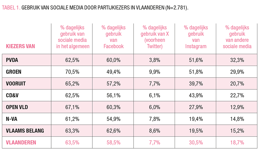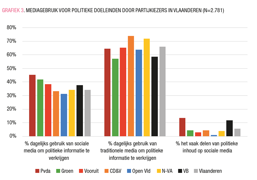 Tot slot is er een duidelijke trend waar te nemen als het gaat om online activisme: het electoraat van de twee radicale partijen (PVDA, 13%; Vlaams Belang, 12%) zijn veel meer geneigd om politieke inhoud te delen of te posten op sociale media dan de kiezers van andere partijen. Minder dan 1% van de respondenten die op Open Vld stemden, rapporteerde een actief politiek gebruik van sociale media.