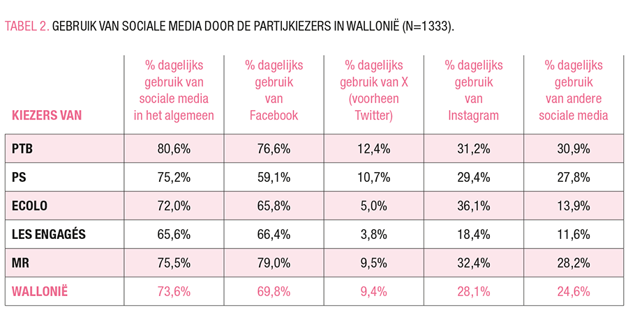 Hoewel de socialemediadiëten bij het electoraat van de Vlaamse partijen twee logica’s lijken te volgen – traditionele versus de radicale (en andere) partijen, en links versus rechts –, zijn deze logica’s niet duidelijk in Wallonië. De twee partijen die eruit springen zijn MR en PTB: hun kiezers zijn aanwezig op alle platformen en informeren zich meer op sociale media dan andere partijkiezers.