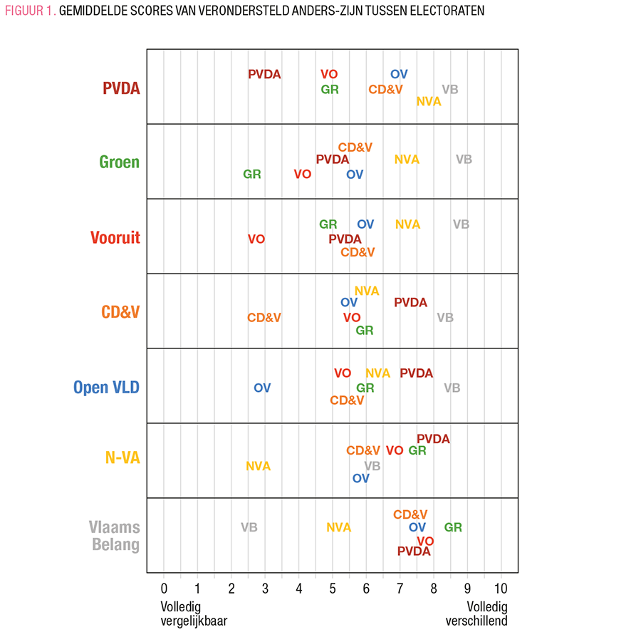 Bovendien tonen deze bevindingen dat kiezers van de uiterst linkse en uiterst rechtse partijen (PVDA op links en Vlaams Belang op rechts) als meest verschillend beschouwd worden op niet-politiek vlak. Vooral de kiezers van Vlaams Belang, de meest rechtse (en enige radicaal-rechtse) partij in het Vlaams parlement, worden door bijna alle kiezers gezien als zeer verschillend van hen, met uitzondering van de N-VA-kiezers: zij zien de doorsnee Vlaams Belang-kiezer als eerder licht verschillend van zichzelf (gemiddelde score van 6,2/10 op de schaal van anders-zijn).