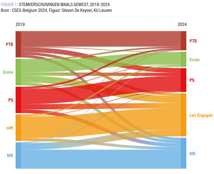 De MR werd natuurlijk afgetekend de grootste partij in het Waals Gewest, met 29,6% van de stemmen. De partij positioneert zich duidelijk rechtser dan de Vlaamse liberalen, en de MR heeft natuurlijk als strategisch voordeel dat ze op haar rechterflank geen enkele concurrentie heeft. Kiezers die in Vlaanderen eerder voor N-VA of Vlaams Belang zouden opteren, zijn dus wel gedwongen om voor de MR te kiezen. Als we aan de respondenten vragen op wie ze in juni 2024 hebben gestemd, en op welke partij in mei 2019, dan zien we bovendien dat de MR bijzonder trouwe kiezers heeft, en nauwelijks aanhangers verliest (FIGUUR 1). Toch moet de glansoverwinning van de MR ook enigszins genuanceerd worden: ook in 2004 behaalde ze reeds 24,3%. Op twintig jaar tijd zijn er dus vijf procentpunten bij gekomen. De MR is dus vooral de grootste partij kunnen worden door het verzwakken van de PS.
